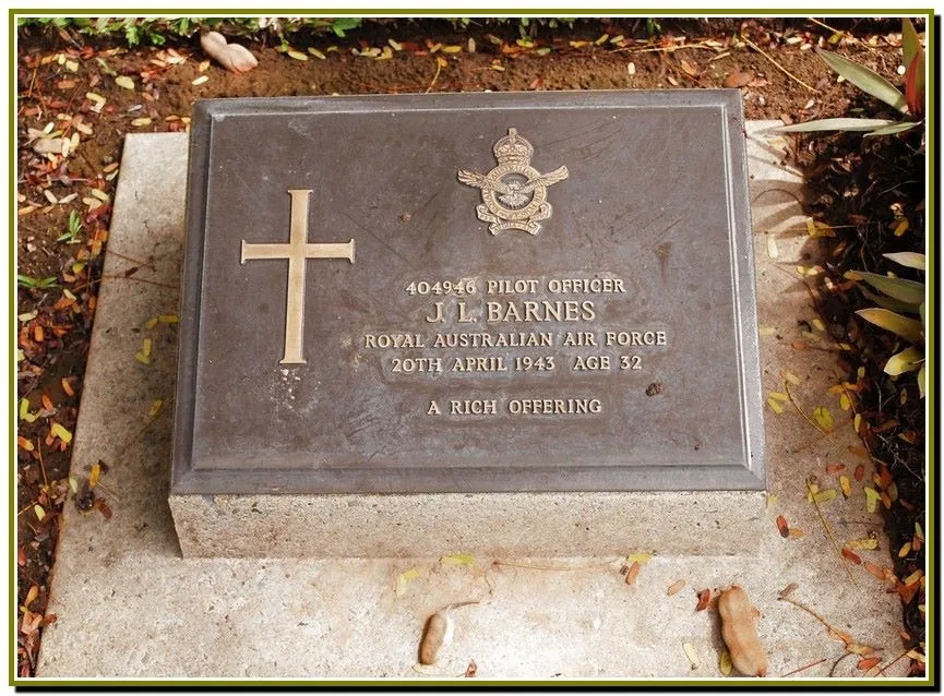 Barnes was initially buried near Millingimbi Island on the 22nd of April, 1943, and was later reburied at Adelaide River War Cemetery, grave C.B.13, on the 1st of September, 1945.