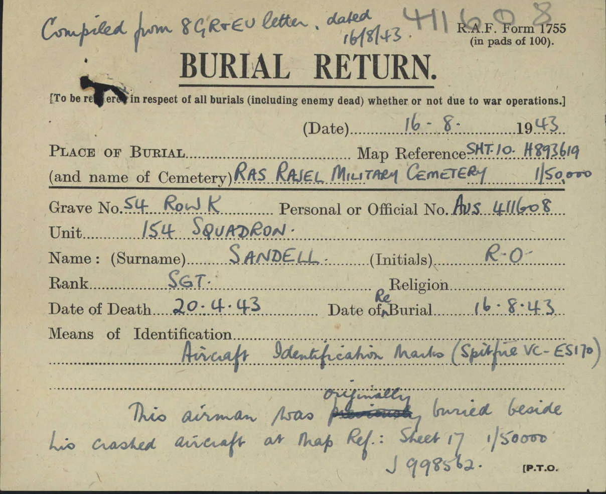 411608 Flight Sergeant SANDELL, Ronald Oakley. Source: AWM 237 (65) NAA: A705, 163/37/77 Commonwealth War Graves records. Aircraft Type: Spitfire VC. Serial number: ES170. Unit: ATTD 154 SQN RAF. Summary: Spitfire ES170 which was flying as Yellow 2, took off from Victoria drome at Souk-el-Khemis on 29th April 1943, with seven other Spitfires of 154 Sqn, North West African Forces. The formation was detailed to patrol the Deja/Medjerda area. When in the vicinity of Cape Serret the engine of ES170 cut out at 23,000 feet, and the aircraft was on fire in the air. The pilot baled out but his chute became entangled in the mainplane and he was killed in the crash. Crew: EAAF 411608 Flt Sgt R O Sandell, (Pilot). Flt Sgt Sandell is buried in the Tabarka Ras Rajel War Cemetery, Tunisia. Tabarka is a coastal town on the Tunisian/Algerian border. The Cemetery is 12kms east of the town on Route P7 to Tunis (and Beja).